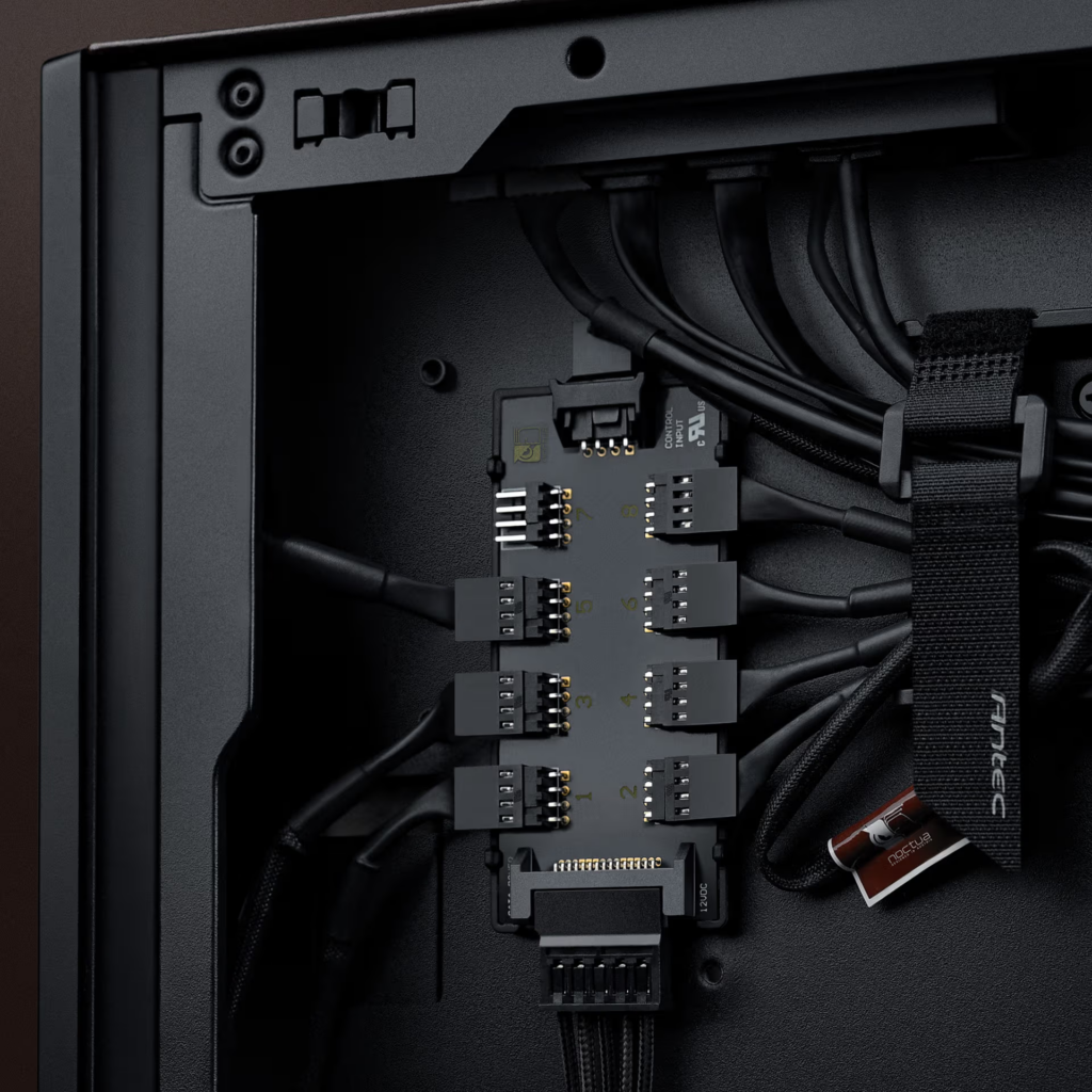 Neben den neuesten Lüftern der G2-Serie von Noctua integriert das Antec Flux Pro Noctua Edition zudem den hochwertigen NA-FH1 Lüfter-Hub, über den sich alle Lüfter über einen einzigen Mainboard-Lüfteranschluss steuern lassen. Der NA-FH1 ist bereits vorinstalliert, und alle benötigten Verlängerungskabel für die Lüfter sind für maximalen Komfort bereits verlegt.