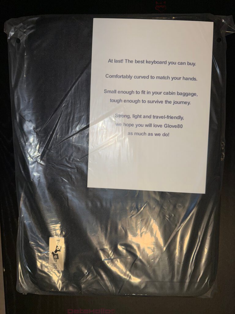 Right under the top flap sits the Glove80’s travel case – sealed in a simple plastic bag. On top, a sheet with a short message: