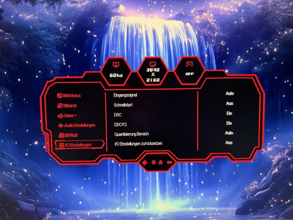 - I/O Settings allow toggling DSC, DDC/CI, Quantization Range, and Quick Start options.
