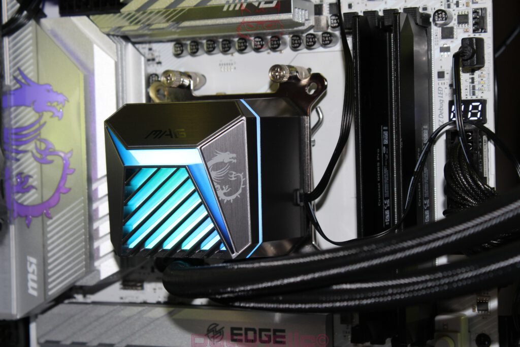 The AIO cooler is black, classic yet modern, dominated by clean lines and accentuated by RGB lighting. The dragon, MSI’s trademark, glows on the pump housing and makes it unmistakably clear: gaming DNA lives here.