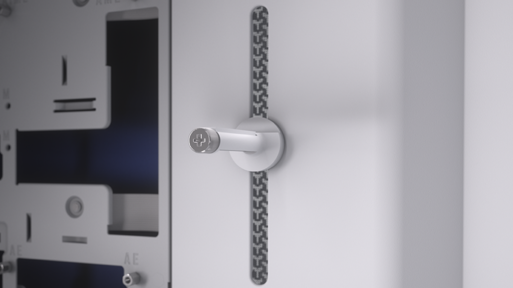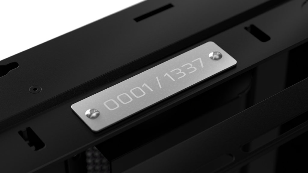 The front I/O has also been updated, now offering three USB Type-C connectors to make charging and connecting your devices easier, with the single yellow port supporting up to 20 Gbps and the two others at 5 Gbps. This front panel features a standard 3.5 mm audio jack and an ARGB power button, allowing users to match the lighting in their builds for an all-over aesthetic. This power button uses an MX-Style green mechanical switch for a satisfying feel, and can be swapped for another mechanical switch offering a different tactile feel. These limited-edition cases feature individually numbered aluminum badges riveted onto the top of the case next to the InfiniRail™ section.