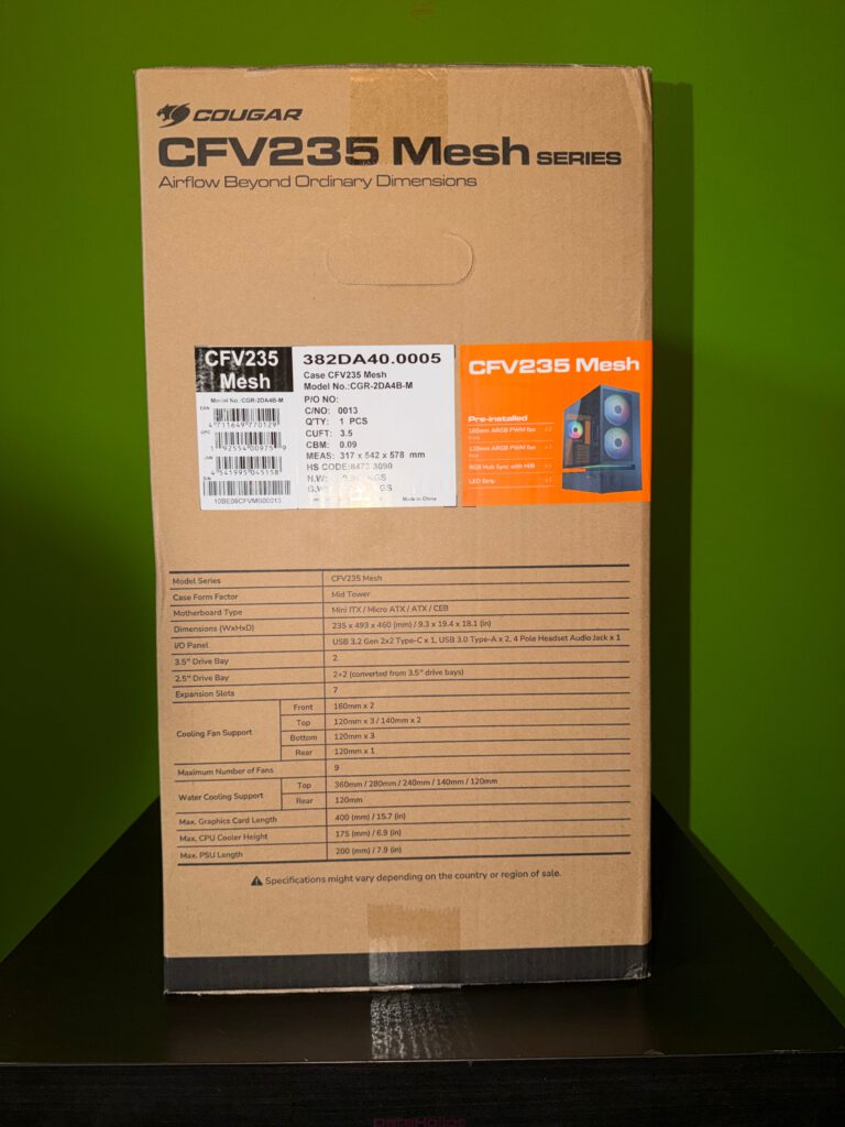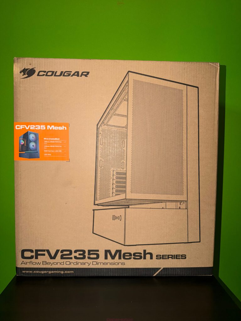 The delivery guy sets down a box far larger than what one expects from a typical mid-tower. The brown carton carries the usual Cougar visual: a stylized sketch of the case, the model name “CFV235 Mesh Series,” and the tagline “Airflow Beyond Ordinary Dimensions.” No comic mascots, no aggressive gamer marketing — pleasantly understated.