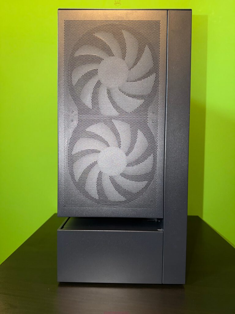 The front is almost entirely made of fine steel mesh, behind which two preinstalled 160 mm ARGB PWM fans sit. Their blades subtly show through the mesh — understated when the system is off, clean and elegant when illuminated.