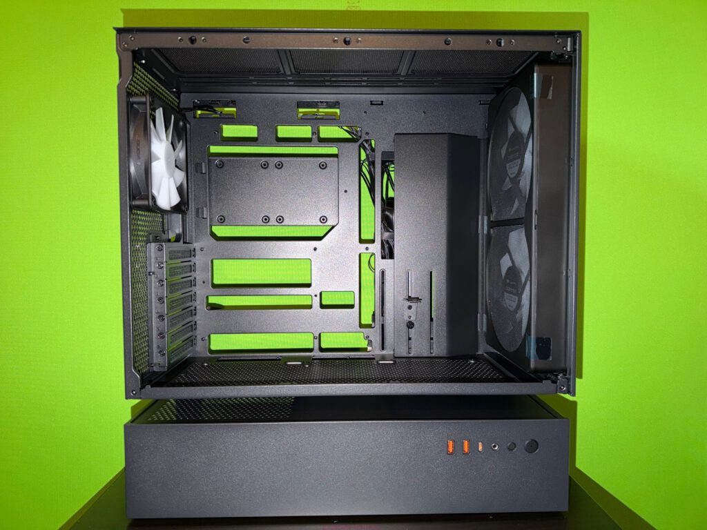 Inside, the raised motherboard chamber becomes immediately noticeable. The large 160 mm fans dominate the front area, forming a strong air column directly into the main chamber.