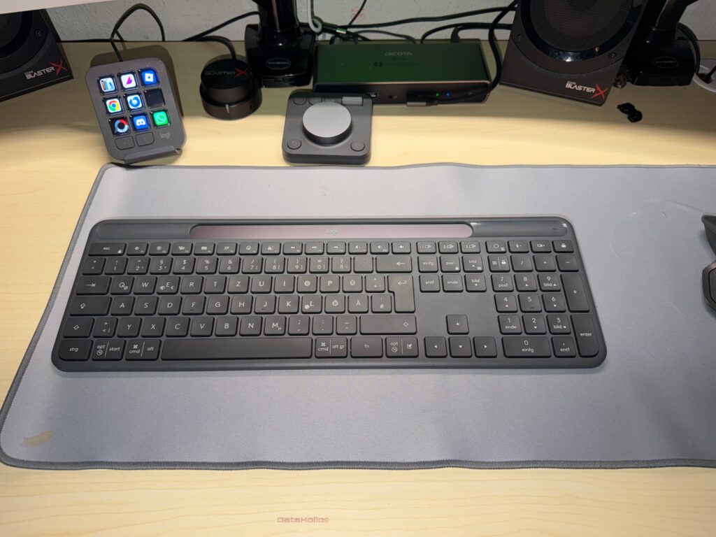 Optisch gibt sich die K980 zweckschön: der Solarbalken als visuelles Alleinstellungsmerkmal, die sanft abgerundeten Kanten, die grau-anthrazitfarbene Zurückhaltung. Auf dem Schreibtisch fügt sie sich harmonisch ein – neben Dock, Lautsprechern, Stream-Deck und Maus entsteht kein Stilbruch. Gerade unter einem breiten Monitor wirkt die flache Silhouette aufgeräumt. Das kennt man von Geräten, die nicht unbedingt Blickfänger, sondern Blickfreihalter sein wollen.
