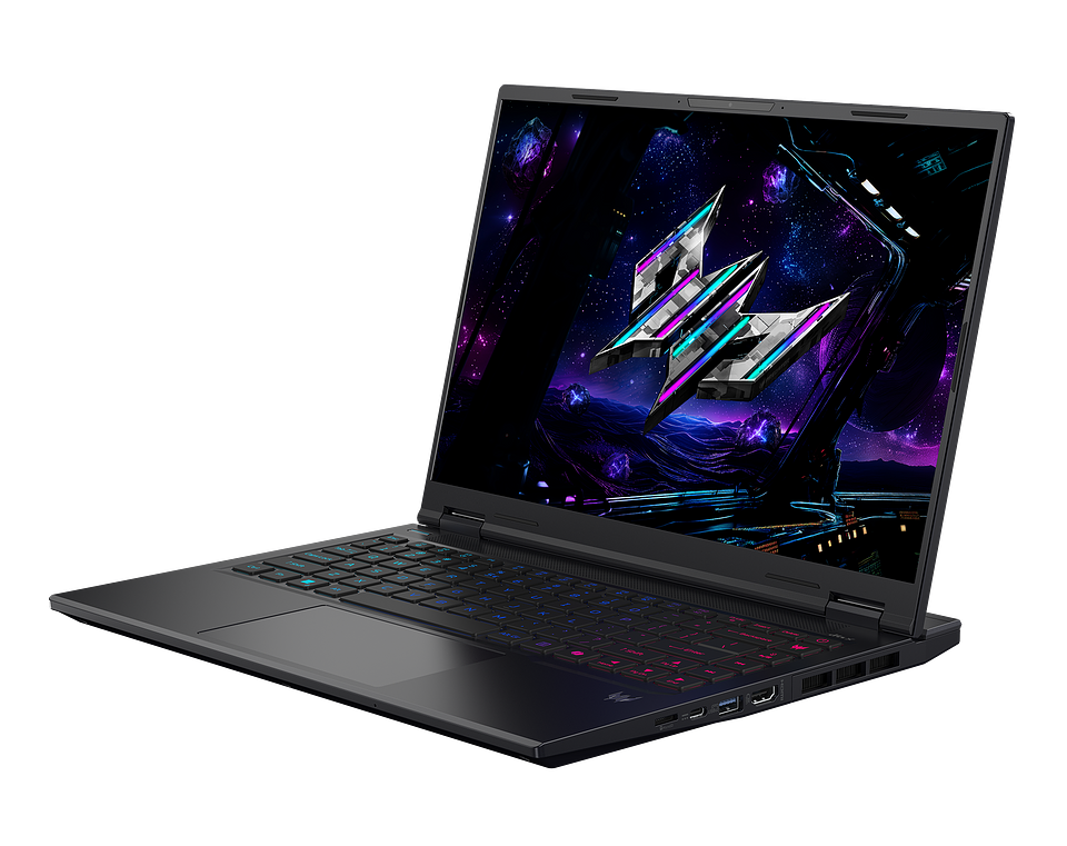 Das brandneue Predator Helios Neo 14 AI (PHN14-71) Gaming-Notebook erweitert Acers beliebte Helios Neo-Reihe. Es unterstützt bis zu einem Intel® Core™ Ultra 9 Prozessor 285H und bis zu einer NVIDIA® GeForce RTX™ 5070 Laptop GPU mit DLSS 4. Es bietet bis zu 32 GB schnellen LPDDR5X 6.400 MHz Onboard-Speicher, während bis zu 2 TB PCIe Gen4 SSDs Speicherplatz bereitgestellt wird. Das Predator Helios Neo 14 AI ist mit einem 14,5-Zoll OLED-Display im 16:10 Format mit 2,8K WQXGA+ (2.880 x 1.800) ausgestattet, das eine Reaktionszeit von 0,2 ms aufweist und 100 Prozent der DCI-P3-Farbspezifikation unterstützt, so dass sowohl Spiele als auch die Arbeit mit hoher Farbgenauigkeit dargestellt werden können. Es bietet ausserdem Unterstützung für NVIDIA® Advanced Optimus. Die Kühlung all dieser Leistung in einem so schlanken Gehäuse ist dank Acers 5th Gen AeroBlade Technologie, Flüssigmetall-Wärmeleitpaste auf der CPU, einer Vector Heatpipe und Acers Vortex Flow System ein Kinderspiel.