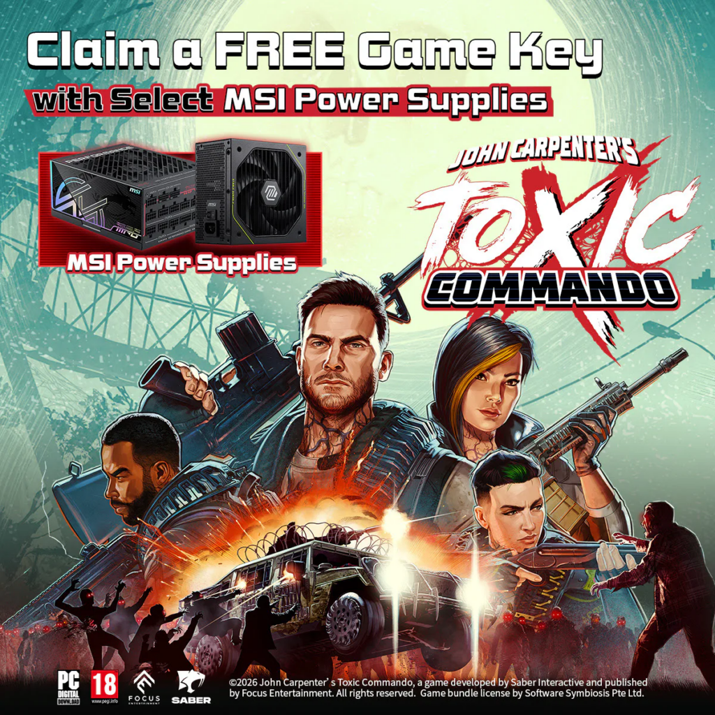 Im Zeitraum vom 12. März bis zum 12. April 2026 können Fans beim Kauf ausgewählter MSI-Netzteile einen kostenlosen Spiele-Key für den Titel „John Carpenter’s Toxic Commando“ erhalten. Die Einlösung der Keys startet offiziell am 26. März 2026.