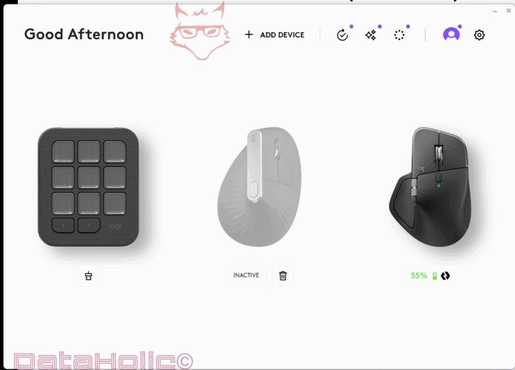 If one of the devices appears as “Inactive” (grayed out), this isn’t an error. It simply means it’s not connected or is in deep sleep. A click on the tile, a short movement/press on the mouse, or switching the connection (Bolt ↔ Bluetooth) brings it back.