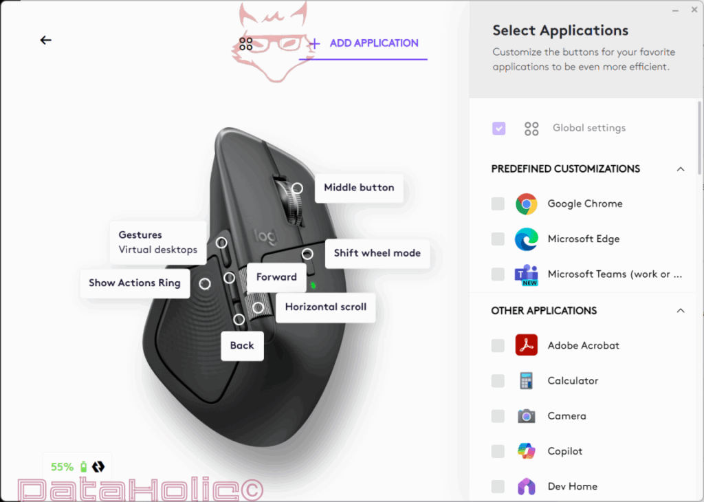 Top right there’s also “Add Application”: this unlocks the per-app profile system of Logi Options+. A list of predefined apps (e.g., Google Chrome, Microsoft Edge, Microsoft Teams) can be activated, alongside a section for any other applications. The result is context-dependent button mapping – a central productivity lever.