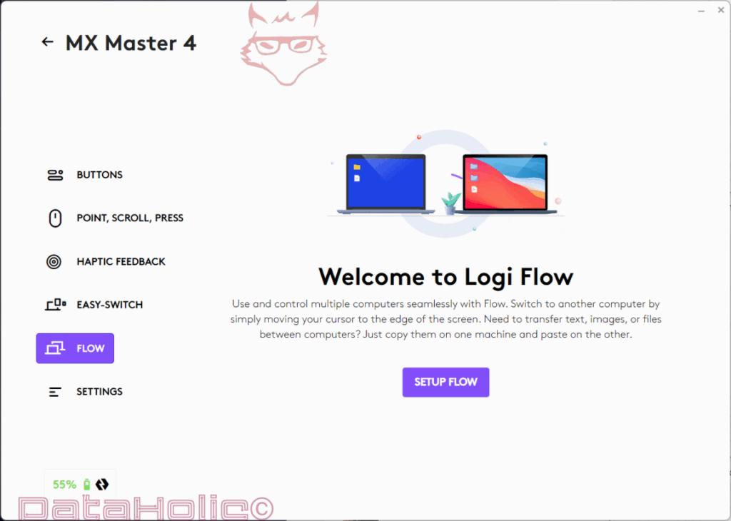 Logi Flow is the magic behind “one mouse, two PCs.” In “Flow”, you’re welcomed with an intro screen and a “Setup Flow” button. The principle:
