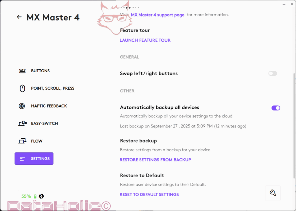 With “Automatically backup all devices”, you never lose settings. On a new machine, “Restore settings from backup” instantly returns profiles, gestures, Actions Ring, scroll settings. For teams, a “golden profile” can be shared – a unified baseline for everyone.