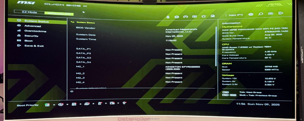Der Menüpunkt System Status fasst zuerst alles zusammen, was hardwareseitig im System steckt: belegte M.2-Slots, SATA-Ports, RAM-Konfiguration, BIOS-Vendor und Build-Datum. Auf unseren Screenshots ist gut zu erkennen, wie das Board zum Beispiel die belegte Kingston-NVMe im Slot M2_1 anzeigt, während weitere M.2-Positionen und SATA-Ports als „Not Present“ markiert sind.