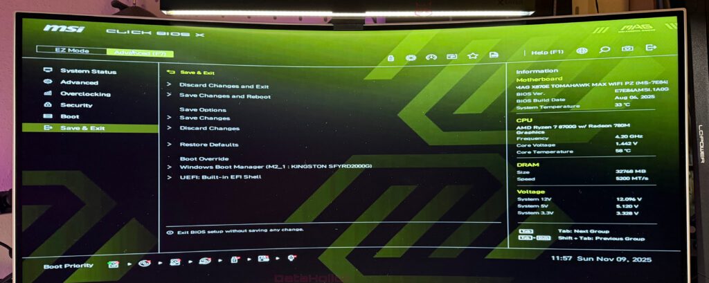 MSIs Click BIOS X ist der Dreh- und Angelpunkt, sobald der Delete-Finger beim Booten zuckt. Die Oberfläche orientiert sich farblich am MAG-Design: dunkler Hintergrund, grüne Akzente, klare Trennung der Bereiche. Die BIOS-Version für das X870E Tomahawk MAX WIFI PZ zeigt das auch optisch, wie die Screenshots aus unserem Testsystem mit Ryzen 7 8700G und DDR5-5200 belegen.