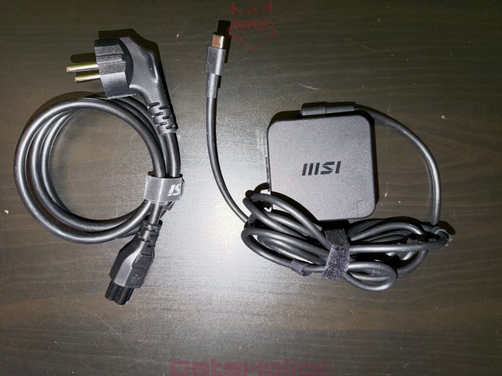 Das Netzteil selbst ist als kompakter, flacher Block ausgeführt, MSI-Logo oben, Kabel sauber geführt und mit Klett gebändigt. Genau dieses Detail – Klett statt Draht – ist nicht spektakulär, aber es reduziert Kabelbruch, weil man das Kabel nicht „knicken muss, bis es passt“. Für ein Gerät, das mobil genutzt wird, ist das sinnvoll.