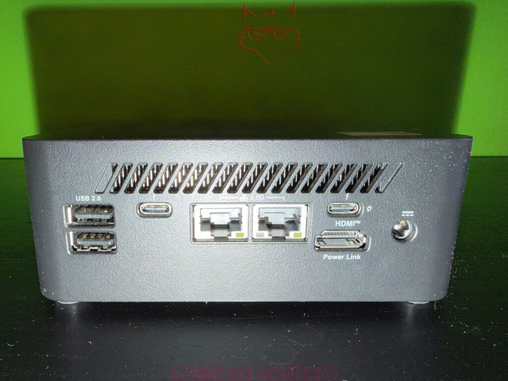 Noch spannender als die Front ist die Rückseite. Dort sitzen zwei USB-2.0-Ports, zwei 2,5-Gigabit-LAN-Anschlüsse, HDMI 2.1, ein Stromanschluss, zwei Thunderbolt-4-Ports und die Öffnung für den Kensington-Lock. Bereits der erste Blick auf diese Ausstattung legt offen, dass der Cubi NUC AI+ nicht als bloßer Office-Zwerg konzipiert wurde. Die Port-Auswahl ist für ein 0,826-Liter-System bemerkenswert erwachsen. Vor allem die Kombination aus zwei schnellen LAN-Anschlüssen und zwei Thunderbolt-4-Ports hebt das Gerät aus der Masse vieler Mini-PCs heraus, die sich entweder auf Consumer-Komfort oder auf ein abgespecktes Gewerbeprofil beschränken. Hier läuft beides zusammen.