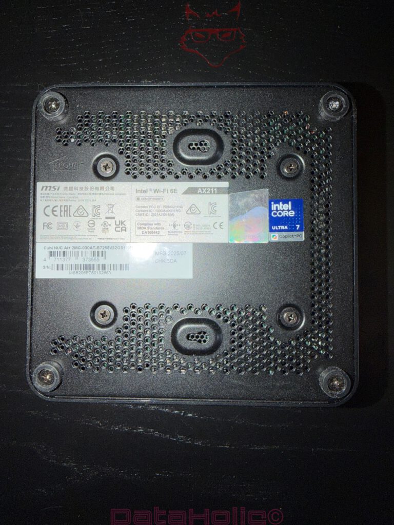 Die Unterseite gehört nie zu den glamourösen Kapiteln eines Unboxings, sagt aber häufig mehr über die Produktqualität aus als jede Schauseite. Beim Cubi NUC AI+ fallen zunächst die großflächigen Belüftungsöffnungen, die stabil wirkenden Schraubpunkte und die sauber eingelassenen Standfüße auf. Die Bodenseite ist kein dekorativer Nachsatz, sondern ein funktionaler Bestandteil des Luftstroms. Das passt zur Geräteklasse und zur verbauten Plattform. Ein Intel Core Ultra 7 258V arbeitet mit 17 Watt Basispower, kann aber im Turbo deutlich darüber hinausgehen. In einem Gehäuse mit weniger als einem Liter Volumen ist thermische Vernunft daher kein Schönheitsdetail, sondern Überlebensstrategie. Allein die Anordnung der Öffnungen zeigt, dass MSI diese Realität nicht verdrängt, sondern konstruktiv beantwortet.