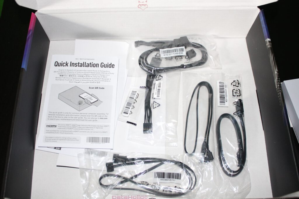 Despite the dominance of NVMe storage, SATA remains part of real-world system builds. MSI equips the board with SATA 6 Gb/s ports, and the included cables reflect this. Large-capacity HDDs, archive drives, or older SSDs are still commonly reused in modern systems. The cables are neatly bundled, often with angled connectors to ease cable routing in tight GPU configurations.