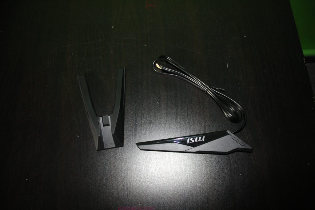 Included in the package is an external antenna that connects to the rear I/O Wi-Fi module. Rather than a simple stick antenna, MSI provides a flat, stable unit with a cable and base that allows flexible positioning. This matters in real-world setups where the PC case is rarely placed in an ideal orientation relative to the router.