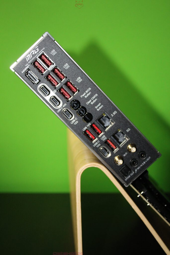 The rear panel includes two USB4 Type-C ports alongside several 10 Gbps USB ports. Clear labeling directly on the I/O shield is a practical advantage, eliminating guesswork in everyday use.
