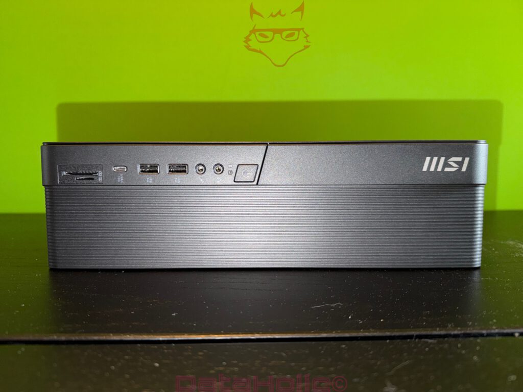 Bürohardware hat ein Imageproblem. Zu oft wird sie als zwangsläufig trist begriffen. Der MSI PRO DP80 zeigt, dass sachliche Gestaltung nicht automatisch freudlos sein muss. Das Gehäuse ist sichtbar zurückgenommen, aber nicht beliebig. Die strukturierte Front, die klare Teilung der Flächen, die leichte Schräge um den Power-Bereich und die abgerundete Unterkante sorgen für genug Eigenständigkeit, damit das Gerät nicht wie ein anonymer Firmenkasten wirkt.