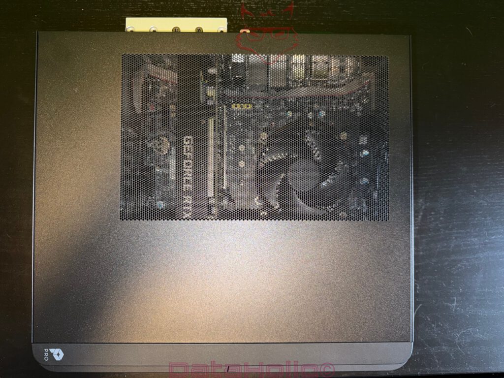 Interessant ist die Oberseite. Dort sitzt eine große perforierte Fläche, die einen Blick ins Innere erlaubt. Das Mesh ist kein dekoratives Fenster, sondern eine funktionale Öffnung, die thermische Arbeit leistet und zugleich signalisiert, dass im Inneren keine minimalistische Versiegelung, sondern eine klassische, zugängliche Rechnerarchitektur steckt. Durch das Gitter sind Komponenten sichtbar, darunter der CPU-Kühler und Teile des Mainboards. Dieser direkte Blick ins Gehäuse vermittelt Ruhe statt Unordnung. Nichts daran wirkt chaotisch oder überladen.