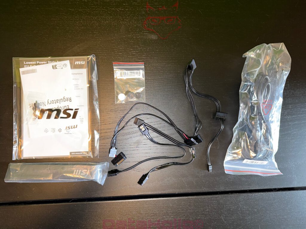 Ein Blick auf das Zubehör macht sehr schnell deutlich, für welches Umfeld dieses System gedacht ist. Auf dem Tisch liegen Dokumentation, Stromkabel, Schrauben, kleine Montageteile und mehrere Anschlusskabel, die eher nach Ausbaumöglichkeit als nach Dekoration aussehen. Hinzu kommt ein weiteres Zubehörteil mit MSI-Branding. Nichts daran soll beeindrucken. Und genau deshalb ist dieser Lieferumfang aufschlussreich.