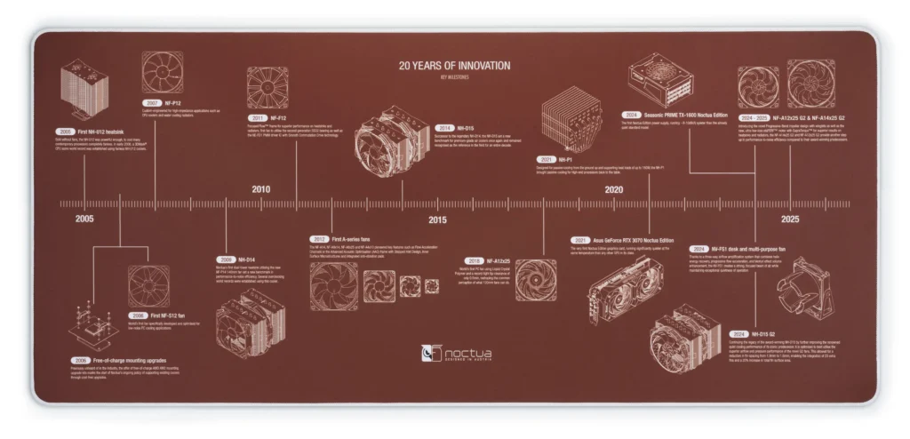 Vienna, October 23rd 2025 – Noctua today celebrated its 20-year brand anniversary with a fresh, completely revamped website as well as the new NP-DM3 desk mat that commemorates key milestones in Noctua’s history of innovation – from the first NH-U heatsinks and NF-S12 fans to landmark products like the NF-P12 or NH-D14 all the way to the latest G2 models.