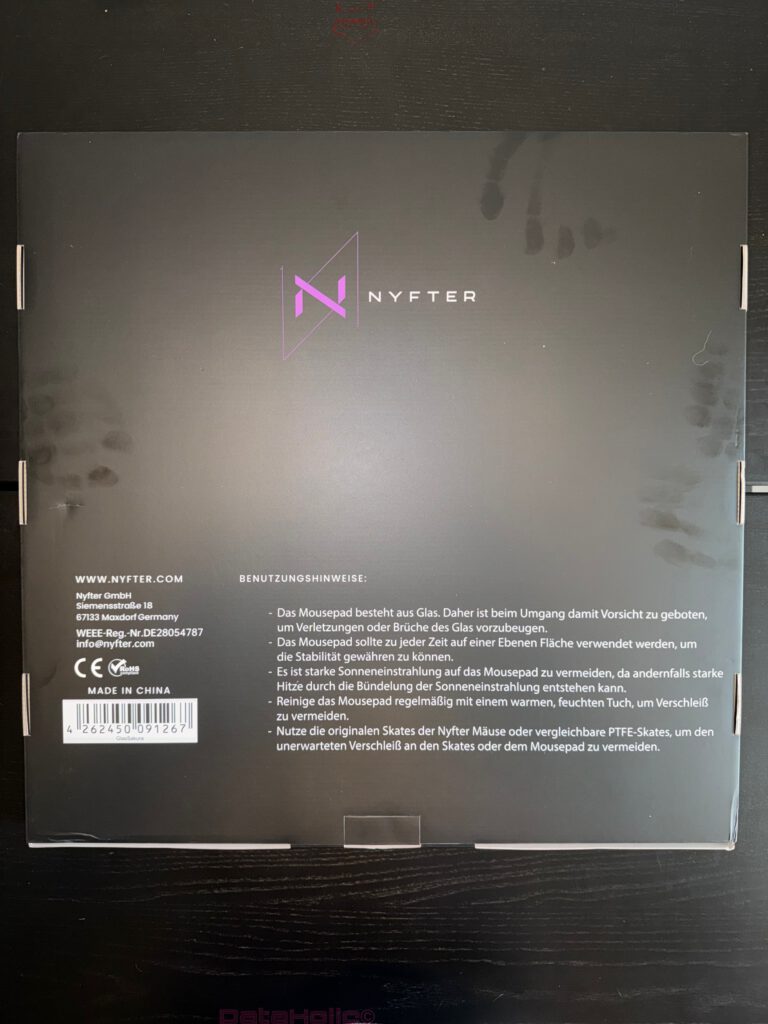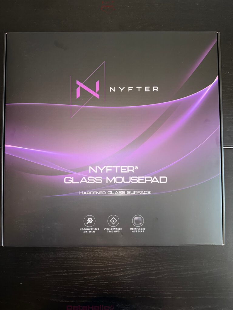 Das eigentliche Schachteldesign spielt sichtbar mit dem Gedanken, dass dieses Produkt nicht als Bürozubehör verstanden werden will. Die violetten Bögen und das klare Nyfter-Logo stellen die Produktklasse in den Kontext von Gaming-Hardware, nicht von Office-Equipment. Das ist relevant, weil Glas-Mousepads in der Wahrnehmung häufig zwischen Designobjekt, Sammlerstück und Performance-Unterlage pendeln. Nyfter selbst spricht auf der Produktseite von „next-level Glide“ bei zugleich „guter Kontrolle“. Diese Kombination ist bei Glasoberflächen die eigentliche Königsdisziplin: Reibung senken, ohne das Tracking in eine unfreiwillige Eislaufnummer zu verwandeln.