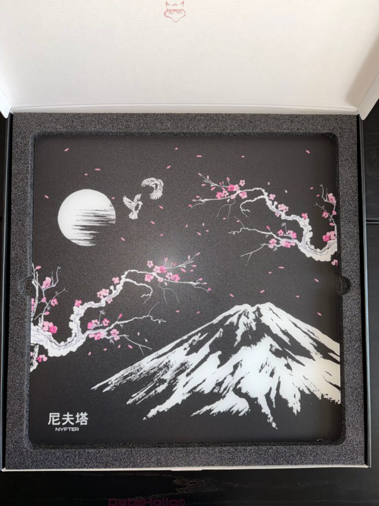 Denn Präzision entsteht nicht immer aus Nachgiebigkeit. Oft entsteht sie aus Klarheit. Das ist vielleicht die eigentliche Botschaft dieses Unboxings. Das Nyfter Nyf Glas Mousepad Sakura will nicht mit Samtpfoten gefallen, sondern mit definierter Materialrealität. Die Verpackung macht daraus kein Geheimnis, die Warnhinweise ebenfalls nicht, und das Produkt selbst schon gar nicht. Es ist groß, starr, glatt, dekorativ und funktional zugleich. Eine ziemlich eigensinnige Kombination, aber genau deshalb interessant.