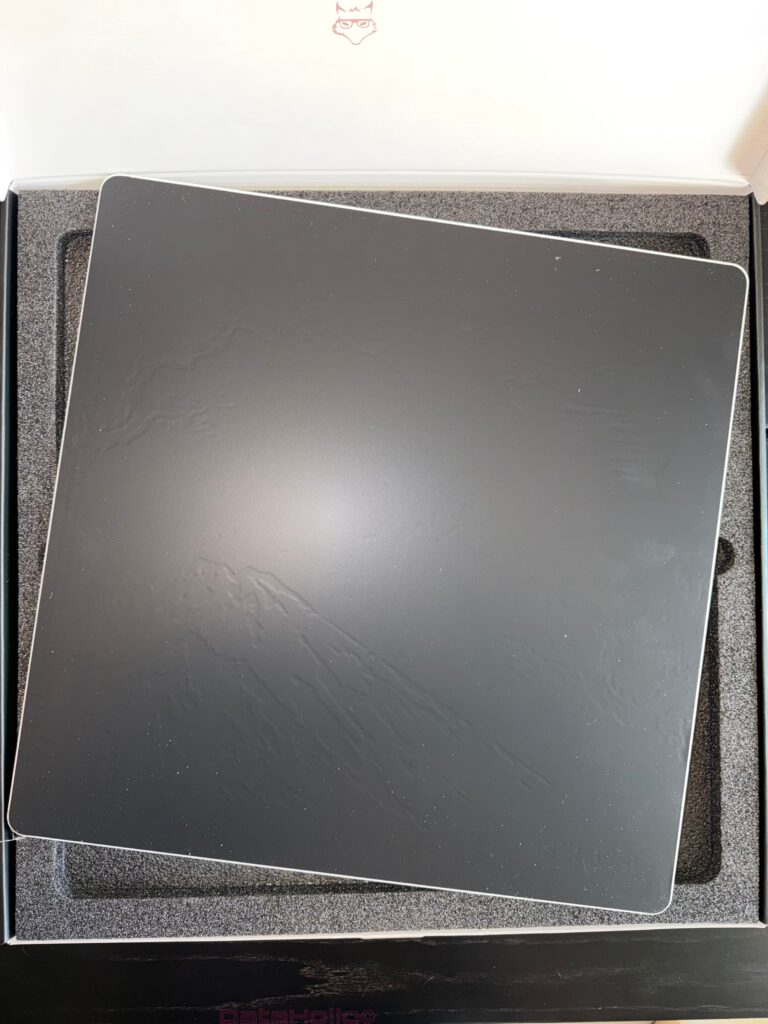Technisch ist das eine interessante Kombination. Die große Fläche erhöht den aktiven Bewegungsraum für Low-Sense-Setups, Arm-Aiming und weite Tracking-Bewegungen. Die Dicke wiederum reduziert die Assoziation eines bloßen Auflegers. Das Pad liegt nicht wie eine dünne Schicht auf dem Tisch, sondern wie ein eigenständiges Objekt. Im Unboxing ist dieser Unterschied sofort sichtbar: Das Produkt wirkt nicht textil, nicht flexibel, nicht beiläufig. Es beansprucht Raum und Präsenz.