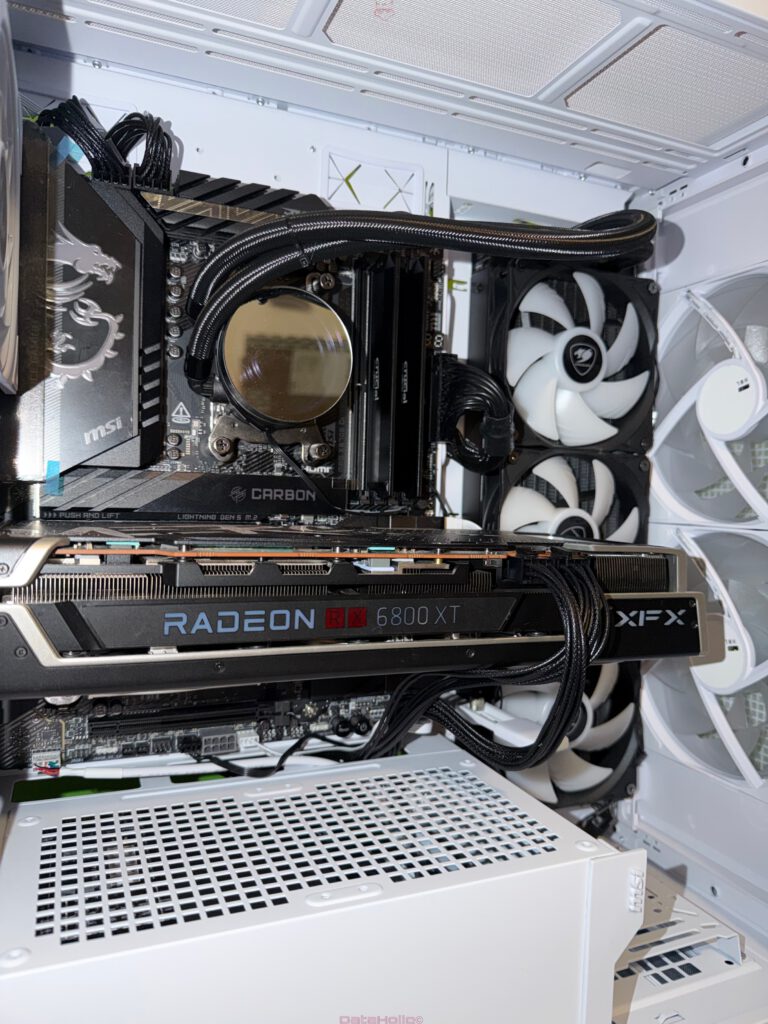 Die Karte wird mit zwei Schrauben an der Slotblende fixiert, die PCIe-Stromstecker werden angeschlossen, und schon dominiert die GPU optisch die untere Hälfte des Systems. Das Board selbst bleibt dennoch präsent, denn die schwarzen Kühlkörper heben sich deutlich vom weißen Gehäuse ab und bilden einen starken Kontrast zu den hellen Lüftern der AIO und des Gehäuses.