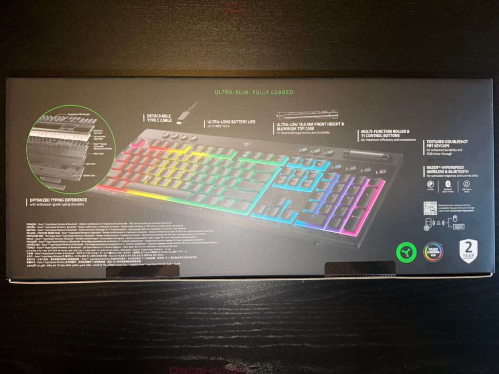 Genau in dieses Feld stößt die Razer BlackWidow V4 Low-Profile HyperSpeed. Das Modell setzt auf ein Full-Size-Layout, kabellose Anbindung per 2,4 GHz oder Bluetooth, USB-C im Kabelbetrieb, Razer Synapse 4, Snap Tap, Hybrid-Onboard-Speicher für bis zu fünf Profile, PBT-Kappen, eine Aluminium-Oberseite, einen Multifunktionsroller, drei dedizierte Medientasten, vier Makrotasten und je nach Variante unterschiedliche Low-Profile-Switches. Die vorliegende Testversion liegt im deutschen ISO-Layout mit Orange Tactile Switches vor. Offiziell führt Razer die Tastatur als Full-Size-Modell mit 437 x 161,5 x 24,5 mm und rund 1052 Gramm Gewicht. Dazu kommen 1000 Hz Polling ab Werk, optional 4K mit separatem HyperPolling-Dongle, Multi-Device-Betrieb über denselben Empfänger sowie bis zu 980 Stunden Laufzeit im Energiesparmodus.