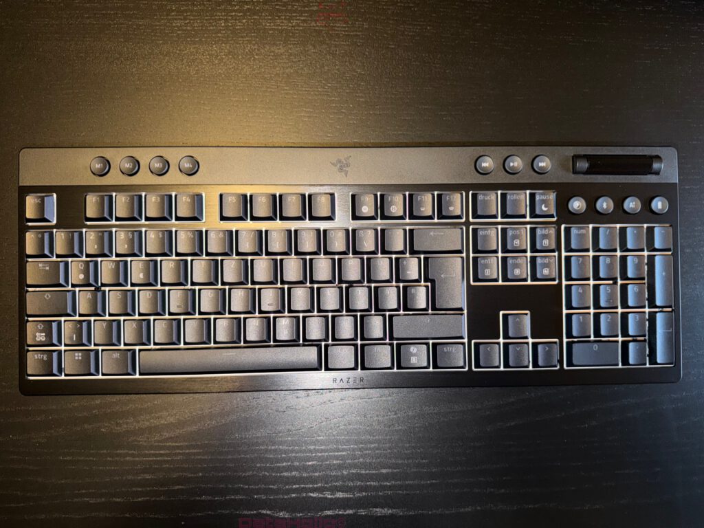Auffällig ist auch die Beleuchtung der Legenden. Die PBT-Doubleshot-Kappen sind laut Razer abriebfester als ABS und für bessere Durchleuchtung optimiert. Die Fotos zeigen eine gleichmäßige Lichtverteilung entlang der Tastenränder und gut ablesbare Legenden. Gerade bei Low-Profile-Konstruktionen gelingt Shine-Through nicht immer sauber, weil Bauhöhe, LED-Position und Kappengeometrie enger miteinander ringen. Hier passt die Ausleuchtung insgesamt gut ins technische Gesamtbild.