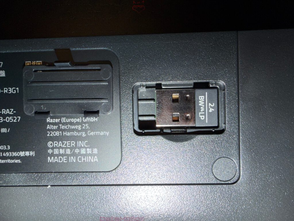Die Fotos bestätigen einen stabilen Gesamteindruck. Die Oberseite zeigt sich verwindungssteif, die Spaltmaße wirken ordentlich, die Übergänge zwischen Ober- und Unterteil fallen sauber aus, und die Tastatur steht dank der Gummiflächen stabil auf dem Tisch. Auf der Unterseite sitzen zwei ausklappbare Füße mit zwei Neigungsstufen. Dazu kommt ein sauber integriertes Fach für den 2,4-GHz-Dongle. Gerade diese Kombination ist praxisnah: Kein loses Fach, kein aufdringlicher Vorsprung, kein improvisierter Clip an der Gehäusekante.