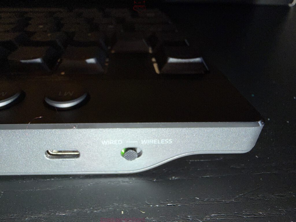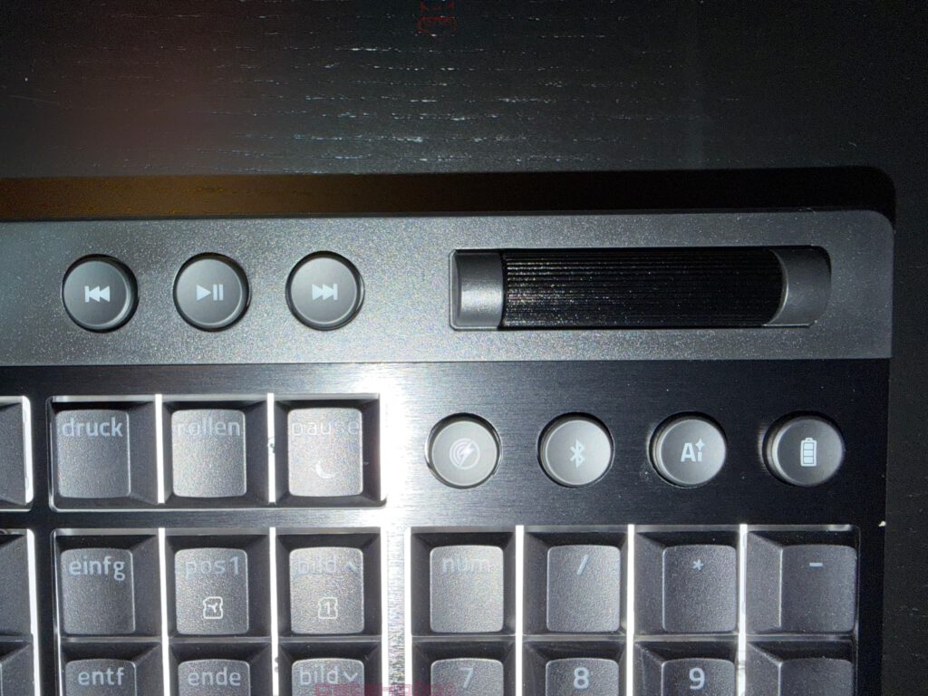Die dedizierte Batterie-Taste gehört zu den unscheinbaren, aber klugen Features des Boards. Gerade bei Wireless-Keyboards sinkt die praktische Qualität oft nicht an der absoluten Laufzeit, sondern an der Unsicherheit über den Restzustand. Eine Tastatur, die im dümmsten Moment überraschend aussteigt, verliert sofort Vertrauen. Hier sorgt Razer für direkte Rückmeldung. Ein Tastendruck reicht, die Ziffernreihe signalisiert den Ladestand. Das ist technisch simpel, im Alltag aber äußerst effektiv.