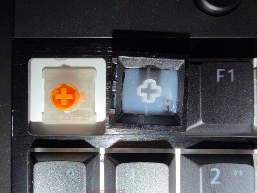 Der vorliegende Schaltertyp ist entscheidend für die Einordnung. Auf dem Gehäuseboden und unter der abgezogenen Kappe ist klar zu erkennen, dass diese Version mit Razer Low-Profile Orange Tactile Mechanical Switches ausgestattet ist. Razer nennt für diesen Schalter einen Auslösepunkt von 1,6 mm bei 45 g Kraft. Gleichzeitig liegt der maximale Hub bei den Low-Profile-Switches der Serie laut Hersteller bei bis zu 2,8 mm. Die Lebensdauer gibt Razer auf seiner Low-Profile-Switch-Seite mit 60 Millionen Anschlägen an.