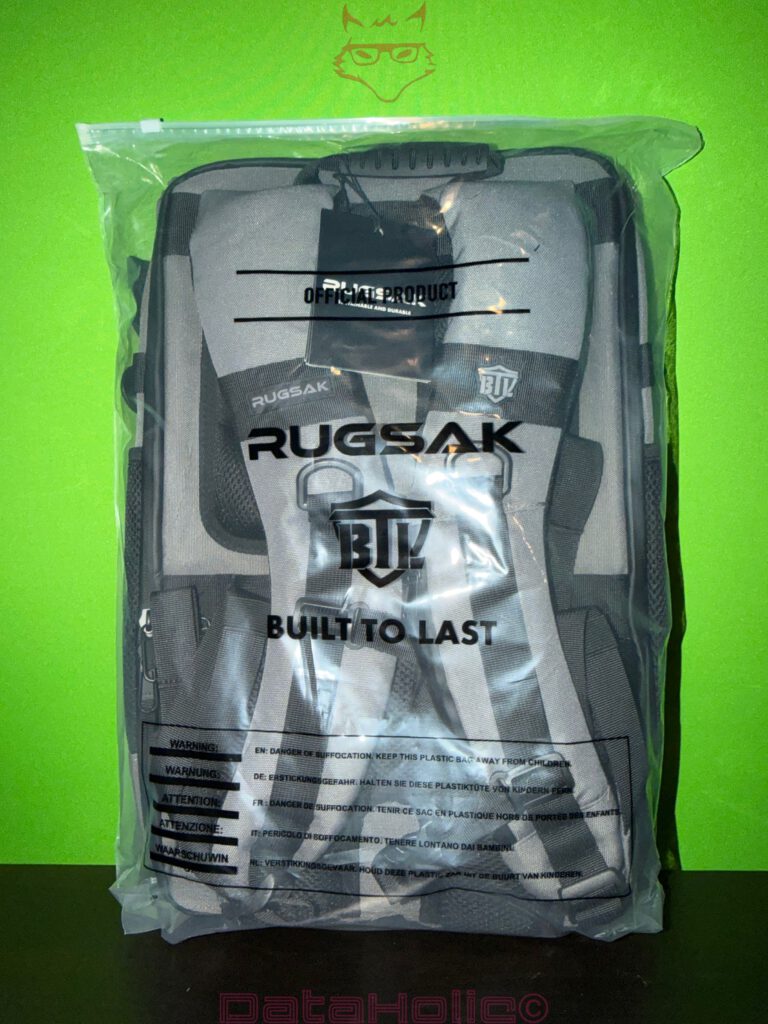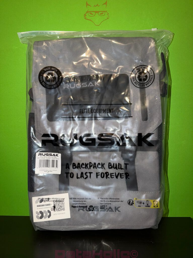Der erste Eindruck ist technisch nüchtern: viel Grau, klare Linien, großflächige Logos und mehrere Aufdrucke mit Schlagworten wie „BUILT TO LAST“ und Hinweisen auf recycelte Materialien. Marketing findet hier bereits auf der Folie statt, doch im Fokus dieses Unboxings steht etwas anderes: Wie konsequent wurde der RUGSAK-Backpack konstruktiv umgesetzt? Welche Detaillösungen verbergen sich hinter dem schlichten Design?