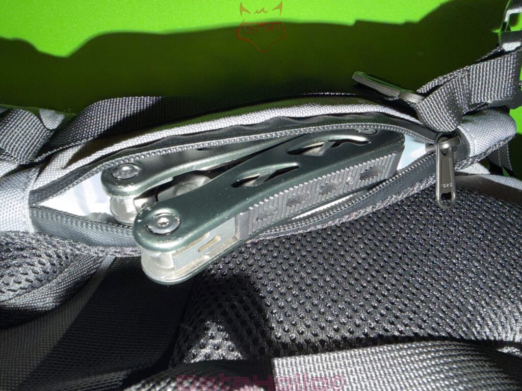 Eine Besonderheit ist das bereits erwähnte Reißverschlussfach direkt im Schulterträger. In den Bildern ist ein Multitool sauber darin verstaut.