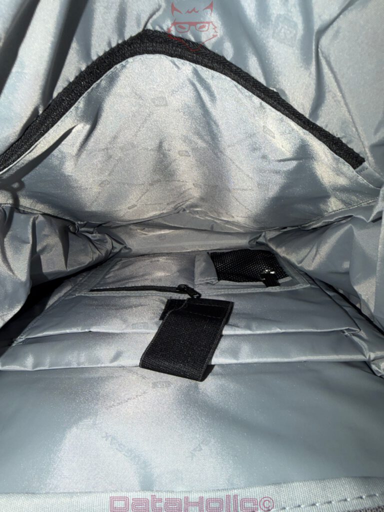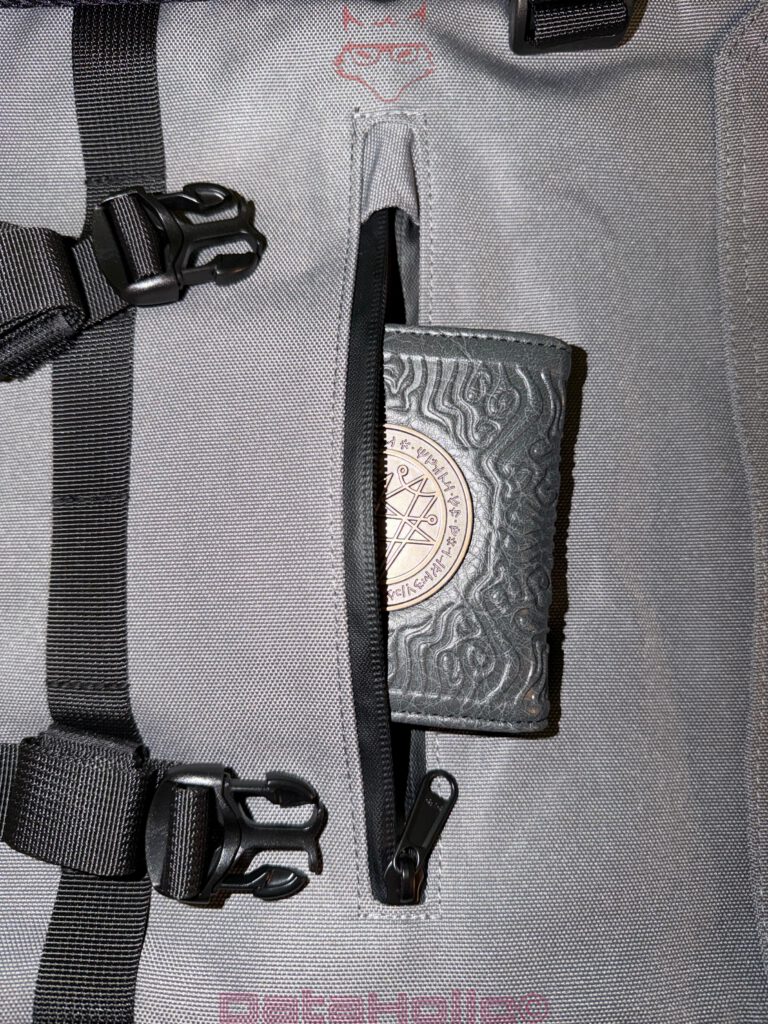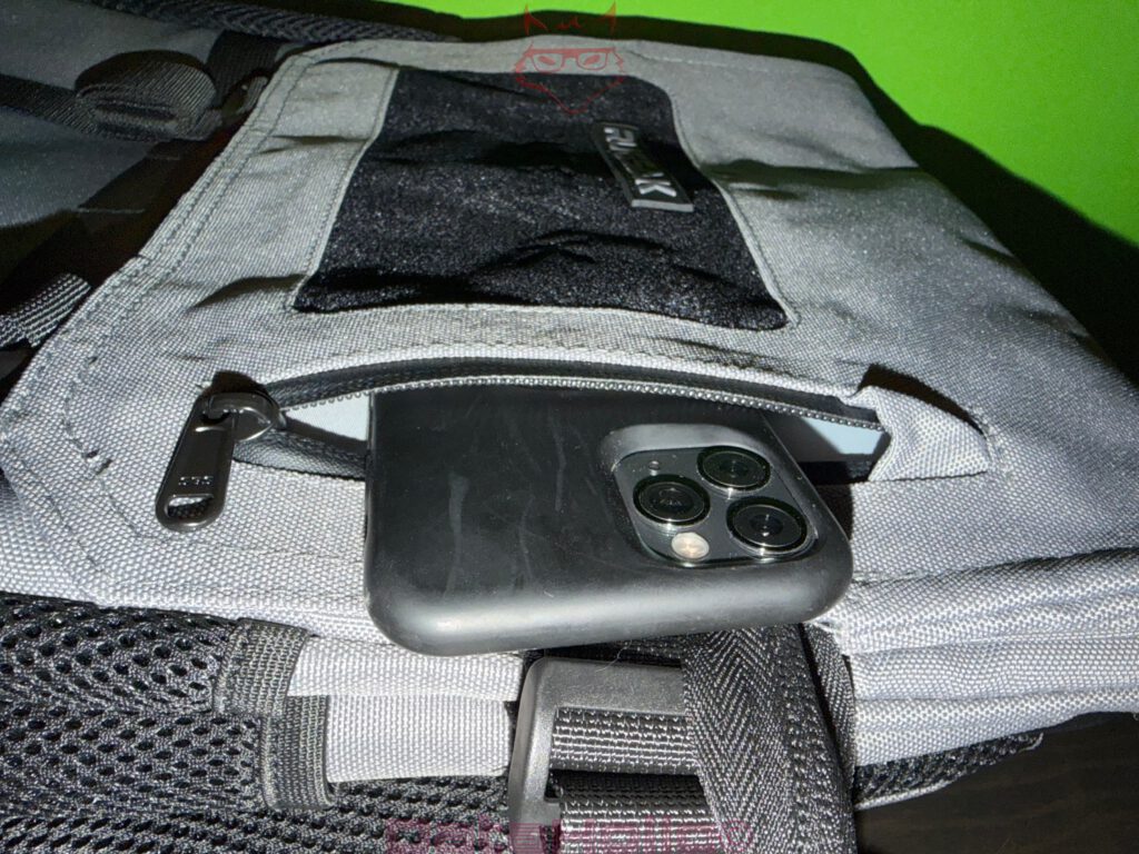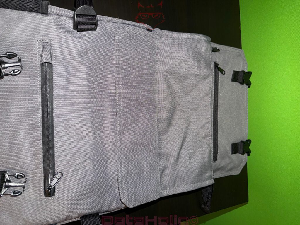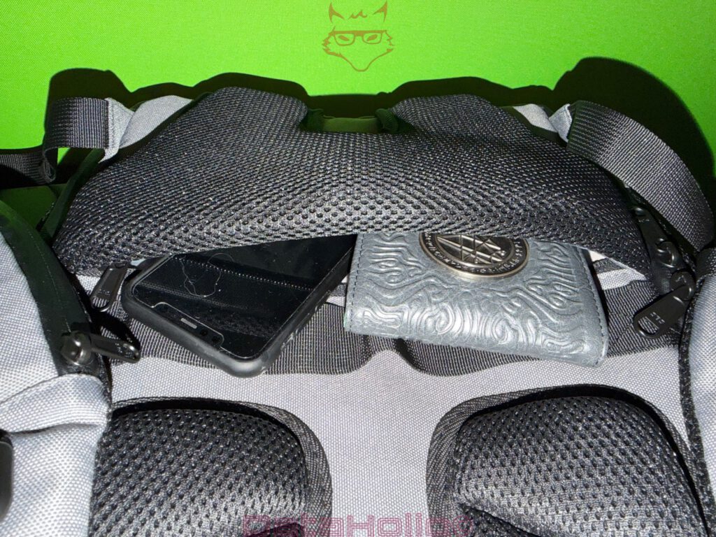 Auf der ergonomischen Seite überzeugen die breiten Schultergurte, die segmentierte Rückenpolsterung und der stabile Tragegriff. Sie ermöglichen eine gleichmäßige Lastverteilung und reduzieren punktuelle Druckstellen. Die Integration zusätzlicher Sicherheitsfächer im Rückenbereich ist nicht nur praktisch, sondern auch sauber umgesetzt. Diese Fächer sind unauffällig genug, um nicht als Angriffspunkte aufzufallen, aber groß genug, um reale Alltagssituationen abzudecken. Wer einen anderen Rugsak wie den Alpha besitzt, kann hier auch den Bauchgurt verwenden, eine Öffnung ist vorhanden.