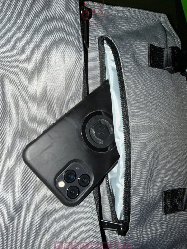 In der Beispielbestückung sind Smartphone und Wallet parallel untergebracht, ohne dass der Reißverschluss unter starker Spannung steht. Durch die Position an der körperzugewandten Seite ist dieses Fach im Alltag nur für die tragende Person zugänglich – ein klassischer Diebstahlschutz.