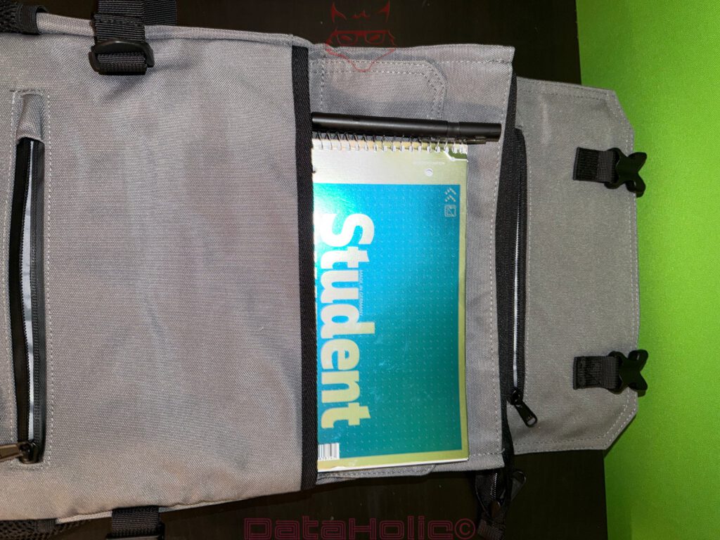 Dieses Fach ist prädestiniert für Gegenstände, die schnell griffbereit sein sollen, aber nicht zu dick sind: Tickets, dünne Notizblöcke, ein flacher Akku, Kabel oder ein kleiner E-Book-Reader. Da die Klappe ohnehin mit zwei Schnallen gesichert ist, ist dieses Fach im Alltag gut geschützt.