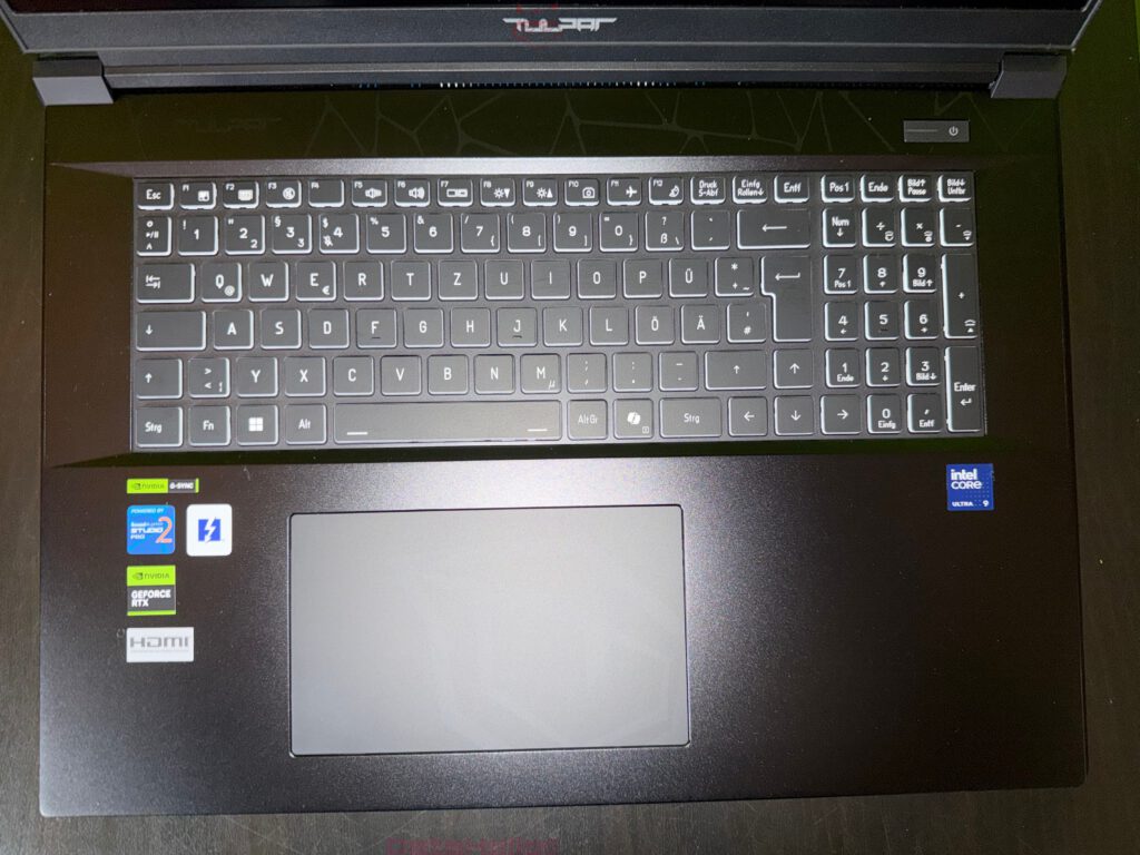 The touchpad is large and centrally positioned beneath the keyboard. A clear border visually separates it from the palm rest. This is not merely cosmetic; it aids tactile orientation during blind use. The palm rest appears robust, matte, and evenly finished. Performance stickers indicate Intel Core Ultra (Ultra 9), NVIDIA GeForce RTX, and technologies such as G-SYNC and NVIDIA Studio, clearly positioning the device as a performance platform rather than an office notebook.