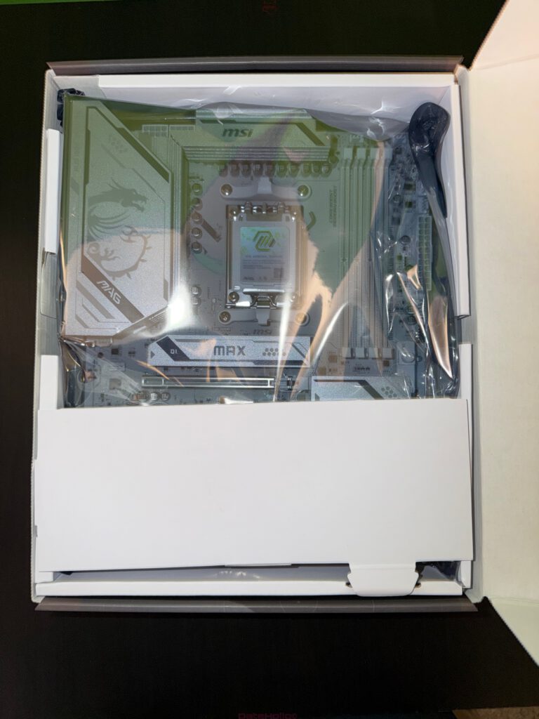 Der Schutzkarton, den MSI über das Board legt, ist sauber verklemmt, sodass nichts verrutschen kann. Wer oft Mainboards auspackt, weiß, dass nicht alle Hersteller sich dieselbe Mühe geben. Hier fühlt sich alles stabil und sorgfältig platziert an.