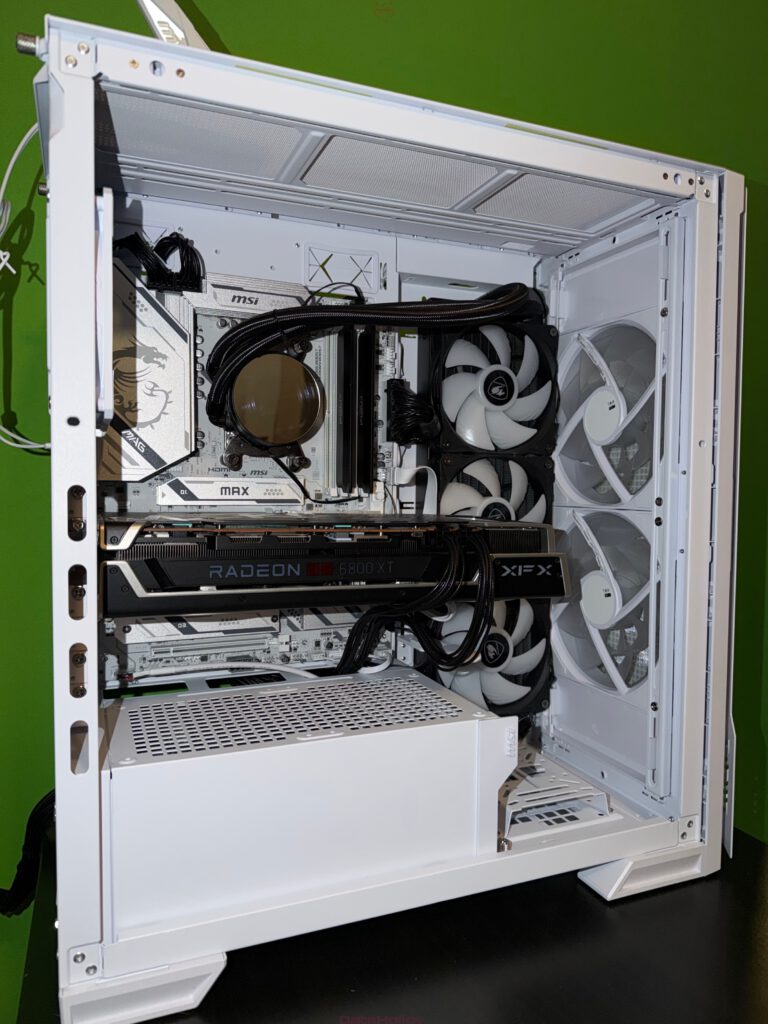 Alle Lüfter sitzen bereits, Kabel sind grob verlegt, der Radiator der AIO ist montiert. Die PSU-Abdeckung gibt ausreichend Freiraum für die Verlegung der PCIe-Kabel für die GPU.
