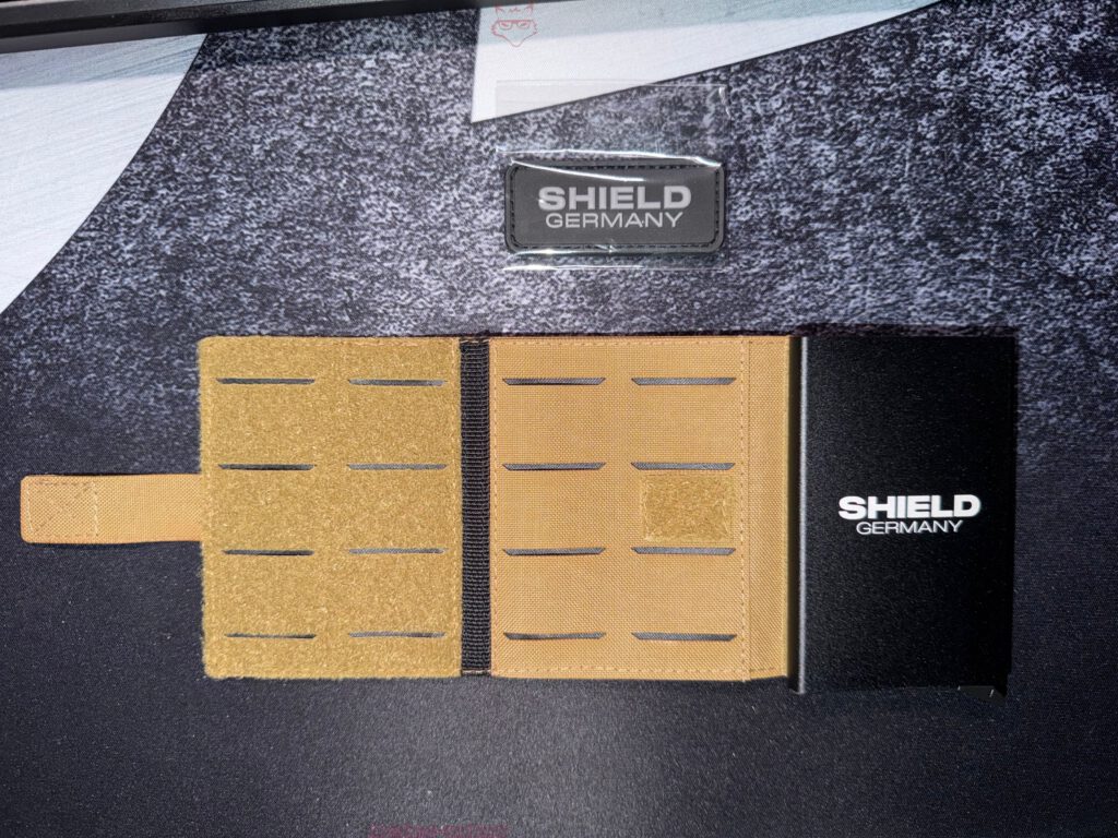 Der Deckel klappt auf, und gleich vorn liegt ein abnehmbares Patch mit dem SHIELD-Logo. Daneben in der Aussparung das Wallet in Coyote-/Sandton, sauber vernäht, mit den markanten Laser-Cut-Schlitzen auf der Außenseite. Unter der Klappe steckt ein Metall-Cardholder (schwarz, mit SHIELD-Branding), wie man ihn aus EDC-Setups kennt: kompakt, kantig, und typischerweise RFID-abschirmend – praktisch gegen unerwünschtes Auslesen kontaktloser Karten.