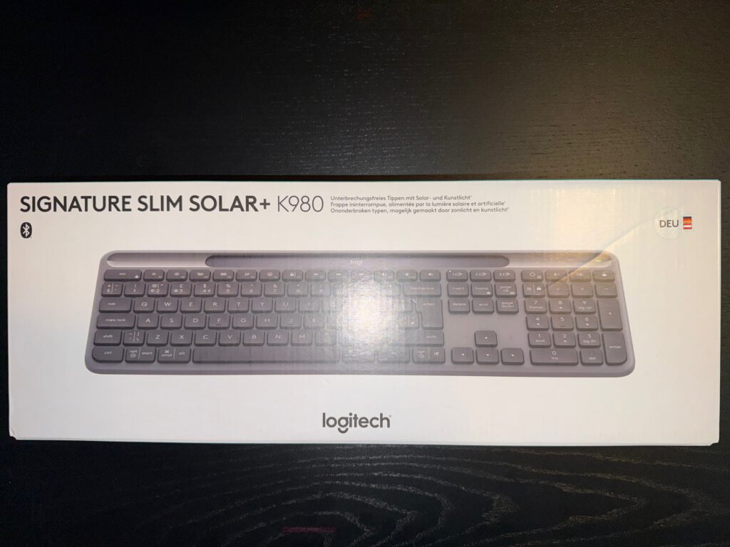 The front of the packaging is classic Logitech: plenty of white space, a centered photo of the slim full-size keyboard, the Bluetooth symbol in the upper left, and the small “DEU” flag in the right corner — indicating the German layout. The model name SIGNATURE SLIM SOLAR+ K980 sits in a neutral, sans-serif typeface — confident but understated. The essentials are there, no more, no less. A short line next to the name reads: “Uninterrupted typing with solar and artificial light.” Precise. Compact. Promising.