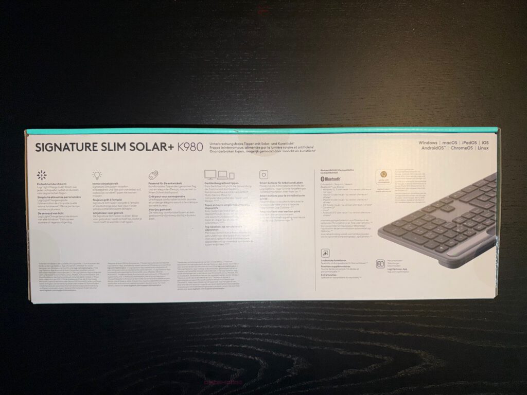 The back continues the story — now more practical. In several languages, including German, English, French, and Dutch, Logitech lists the benefits: simple Bluetooth setup, always ready thanks to solar charging, multi-device connectivity, and broad OS compatibility — Windows, macOS, iPadOS, iOS, Android, ChromeOS, Linux. The layout is typical of the Signature series: to the left, icon-based explanations; to the right, system compatibility and a product close-up highlighting the solar strip — the design’s key element.