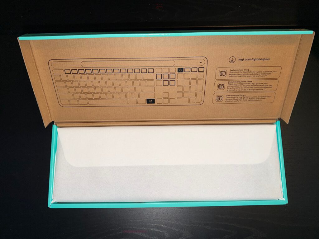 Opening the K980 box requires no knife or scissors — a refreshing change. Logitech has refined its packaging design into something both eco-conscious and pleasantly functional. Once the sleeve is lifted, a mint-colored inner border — Logitech’s Signature turquoise — appears, adding a subtle pop of color. Inside the lid, a printed outline of the keyboard introduces you to the layout and three short notes about the Logi Options+ app — not a demand, just an invitation.