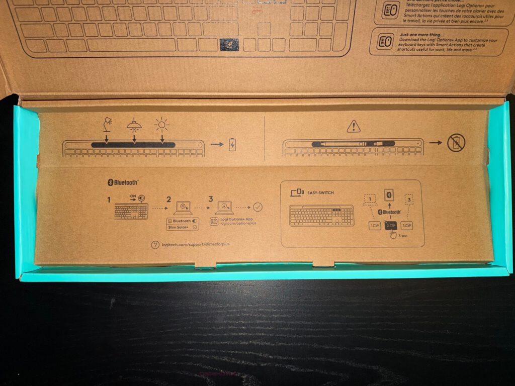 Under the protective layer, the inner cardboard reveals printed instructions — icons showing how to use and charge the keyboard with light, how to switch it on, pair via Bluetooth, and toggle between devices using the Easy-Switch 1–2–3 keys. No manuals, no leaflets. The essential information is exactly where you need it when unboxing. Form follows function — here, even the instructions follow the eye.
