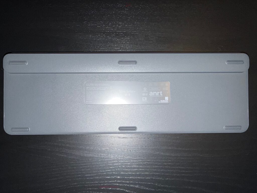 The long, narrow strip above the function row is the solar panel — not glossy black but tinted subtly to match the housing. It’s wide enough to absorb both natural and artificial light effectively. The design integrates function beautifully: what powers the keyboard also defines its aesthetic.
